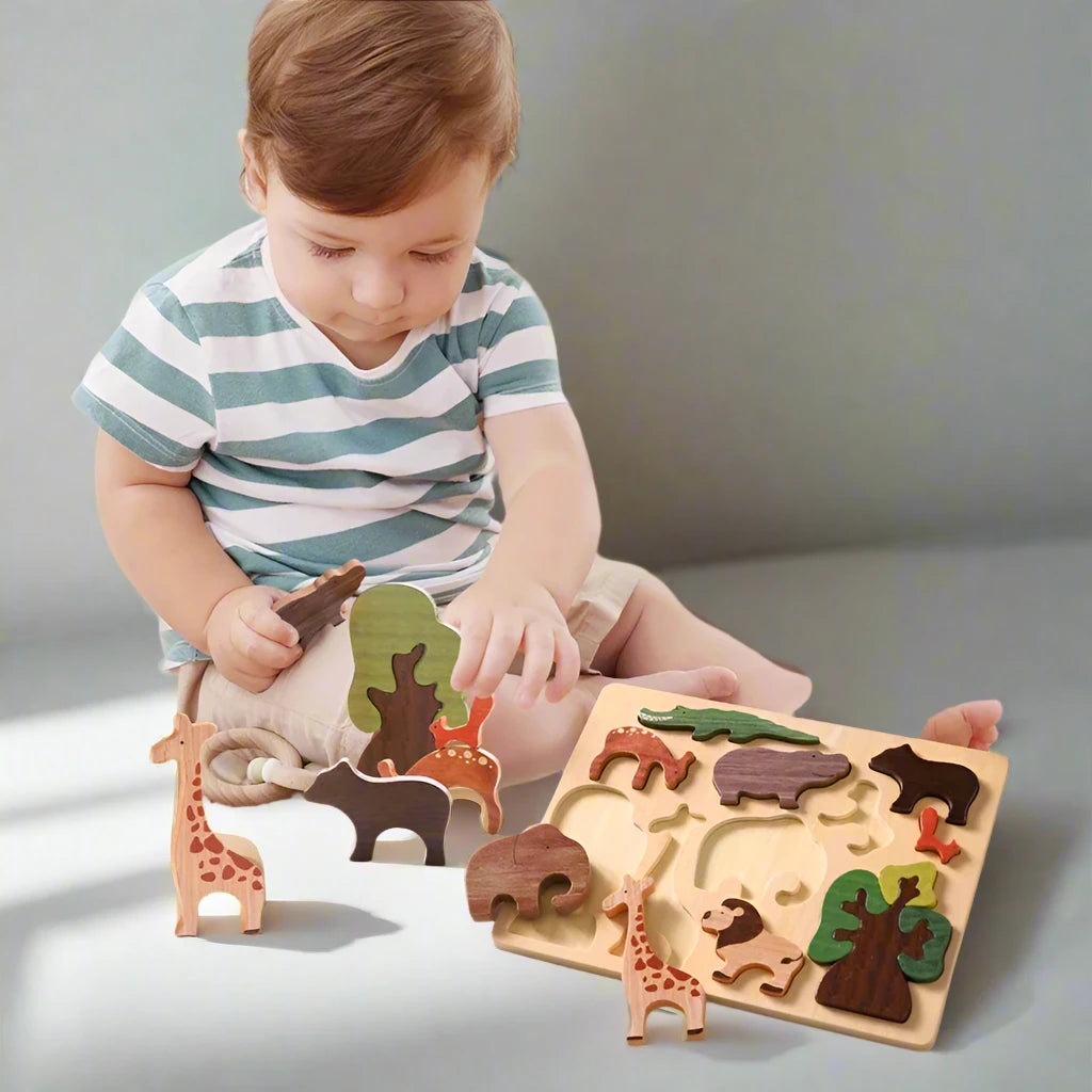 Das aus sicherem, ungiftigem Holz gefertigte Holzpuzzle für Babys ist langlebig und ideal für kleine Hände zum Erkunden. Die leuchtenden Farben und realistischen Tierformen ziehen die Aufmerksamkeit Ihres Babys auf sich und fördern das Problemlösungsvermögen und das räumliche Vorstellungsvermögen.
