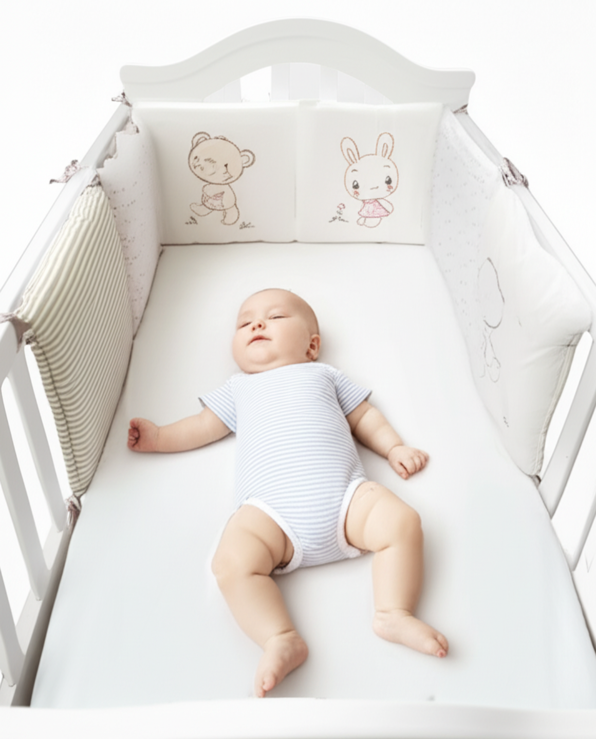 Mit unserer liebevoll gestalteten Babybett-Umrandung schläft dein kleiner Schatz sicher und geborgen. Die weichen Polster verhindern, dass sich dein Baby am Gitter stößt, und schaffen eine behütete Schlafumgebung voller Komfort.