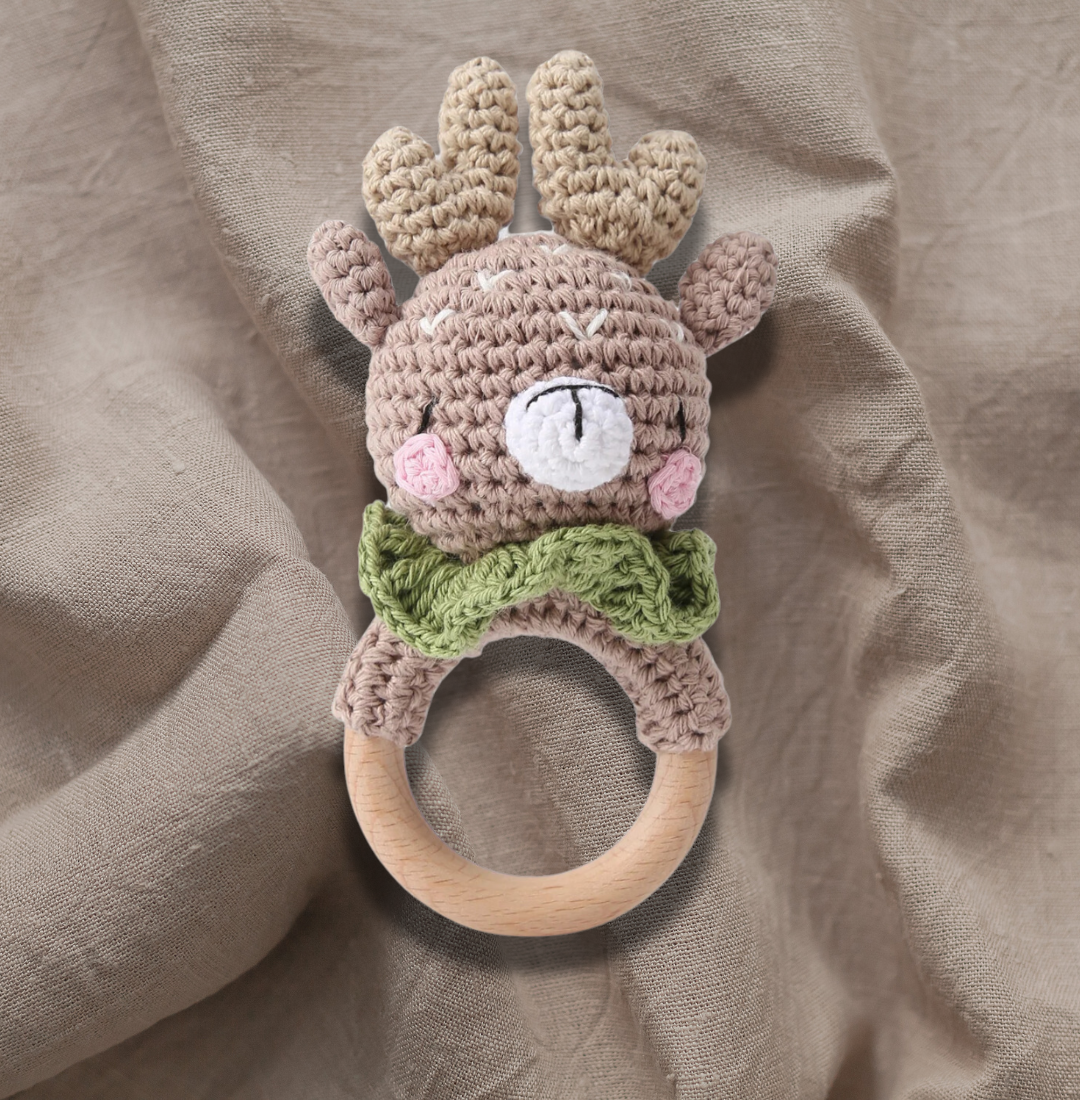 Jede Rassel besteht aus einem hochwertigen Holzring, ideal zum Kauen, und bezaubernden, handgehäkelten Tierfiguren, die die Fantasie deines Babys spielerisch anregen.