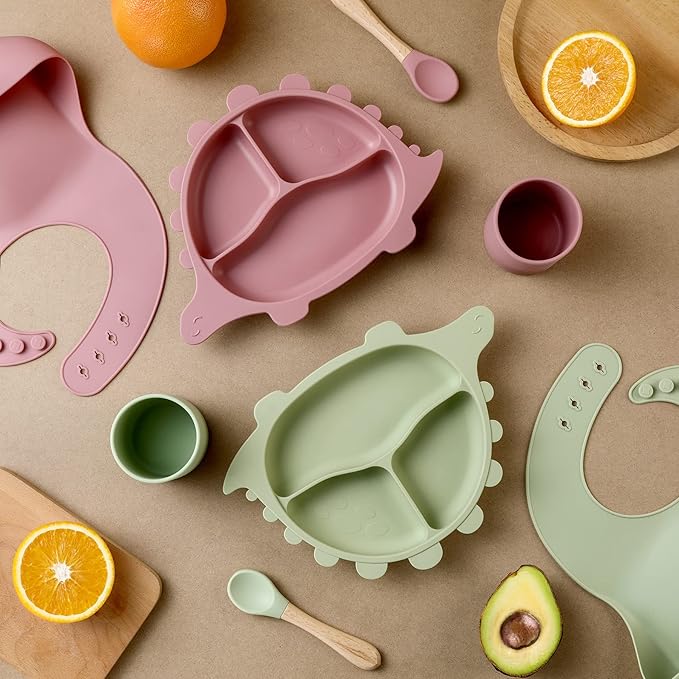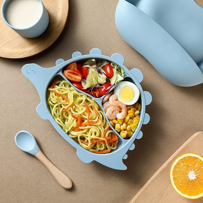 Die ungiftigen, BPA-freien Materialien sorgen für Sicherheit, während die Saugbasis die Geschirrteile sicher an Ort und Stelle hält und das Risiko von Unfällen während der Mahlzeiten reduziert. Erhältlich in kinderfreundlichen Farben wie staubigem Blau und dunkelgrün, ist dieses Set perfekt, um Ihrem Baby feste Nahrung näherzubringen. Spülmaschinenfest und mikrowellengeeignet bietet es Eltern Komfort und Sicherheit, während es gleichzeitig unabhängiges Essverhalten fördert.