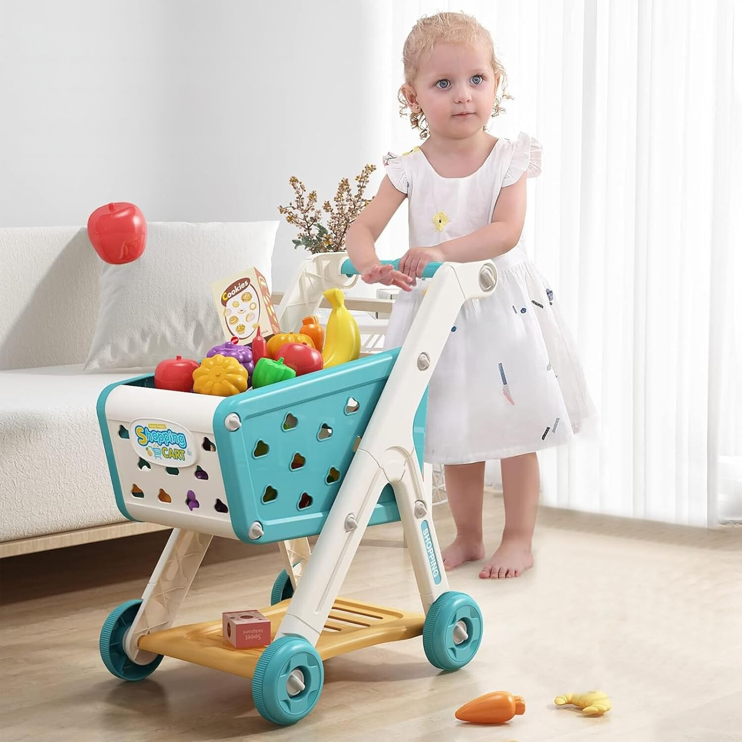 Der Einkaufswagen aus strapazierfähigem, kindersicherem Material enthält bunte Obst- und Gemüsesorten, die die Kinder für zusätzliches interaktives Spielen „ausschneiden“ können. Er eignet sich perfekt für Rollenspiele und fördert die Kreativität, die Feinmotorik und die soziale Entwicklung, während die Kinder stundenlangen, fantasievollen Spaß haben.