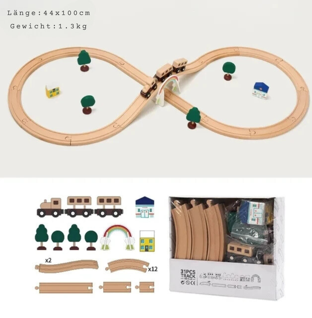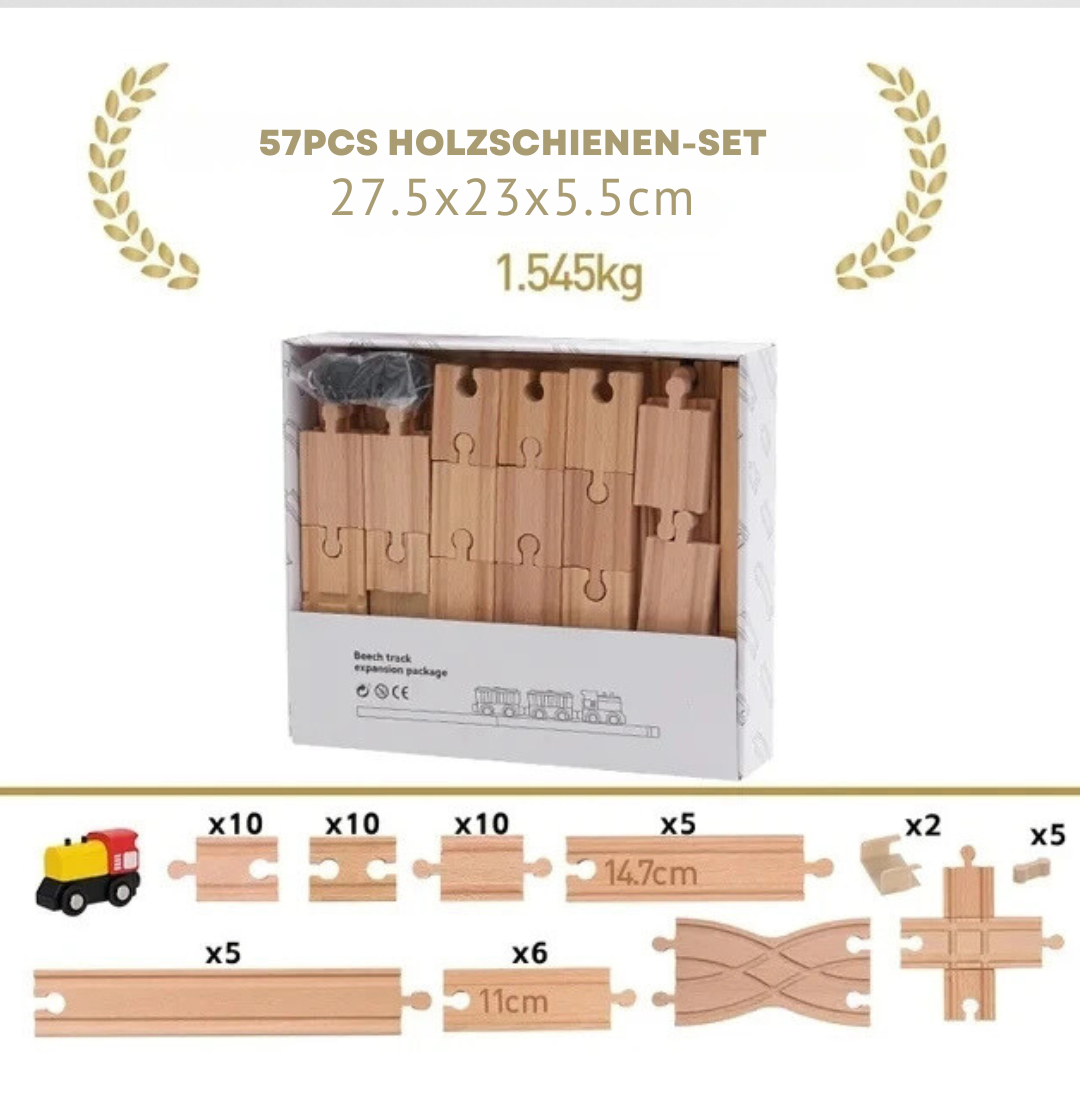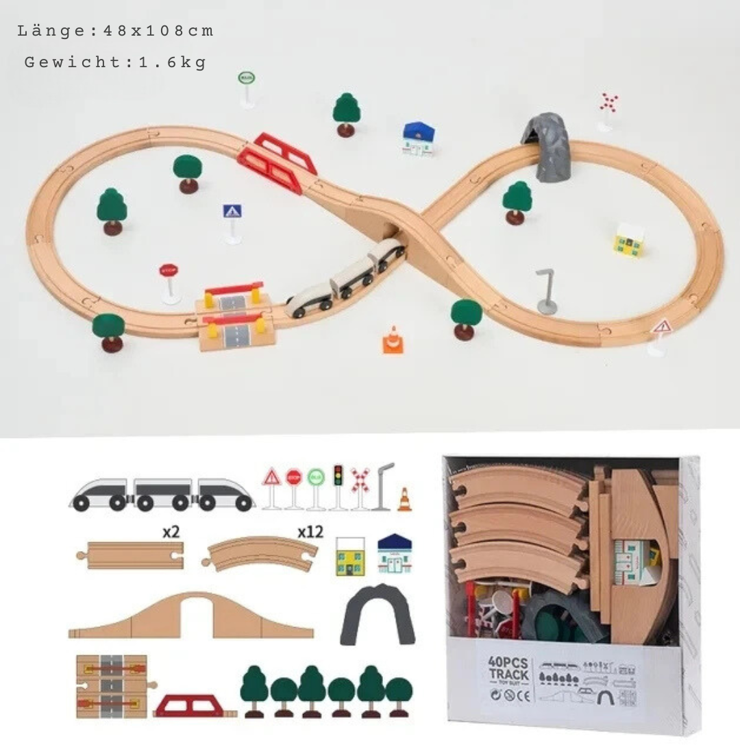 Das Holz-Eisenbahn-Set aus hochwertigem Buchenholz bietet endlosen Spielspass für Kinder. Es ist kompatibel mit allen gängigen Holzschienensystemen und ermöglicht es, Strecken individuell zu gestalten und immer wieder neu aufzubauen. Die robusten, glatt geschliffenen Schienen sind sicher für kleine Kinderhände und fördern Kreativität sowie Feinmotorik.