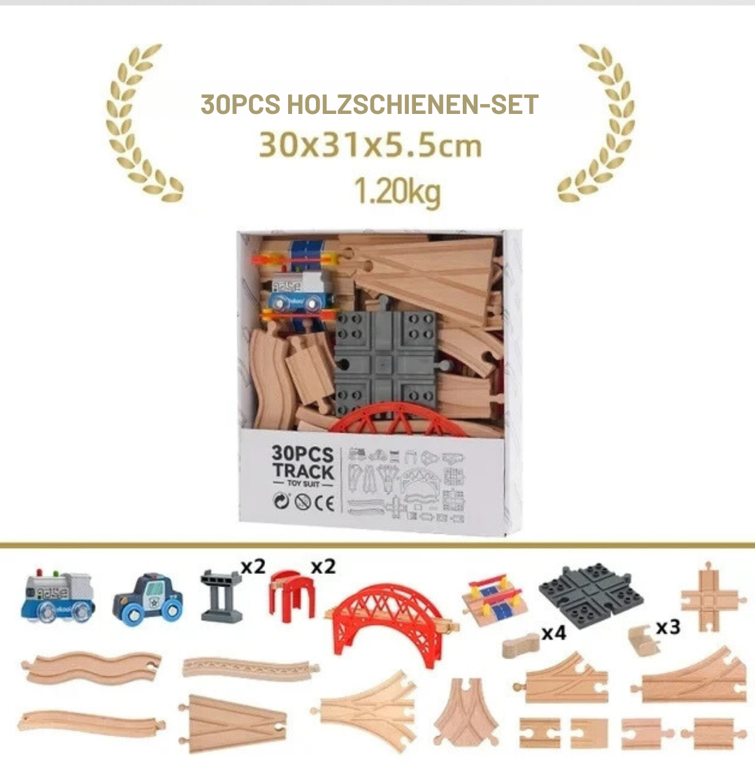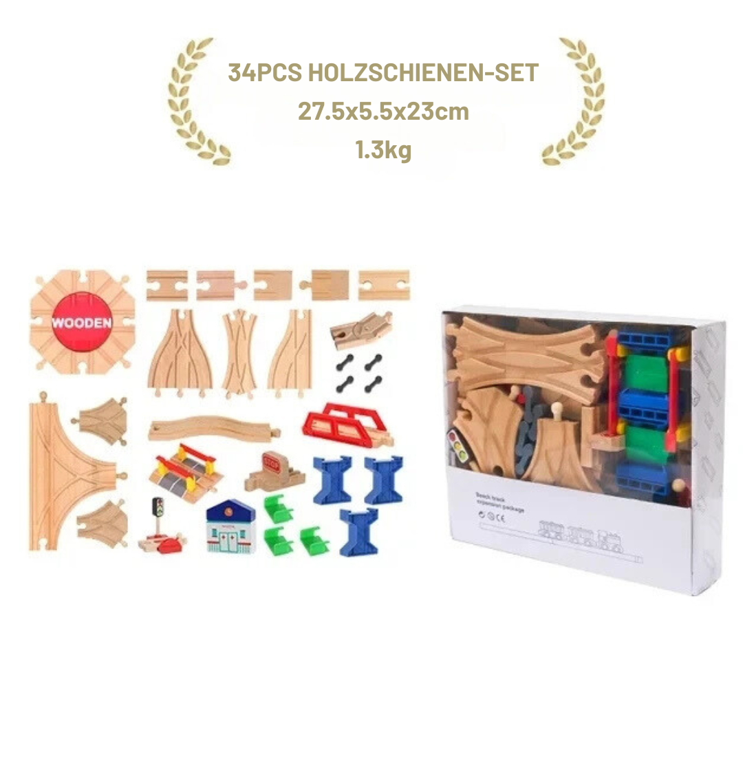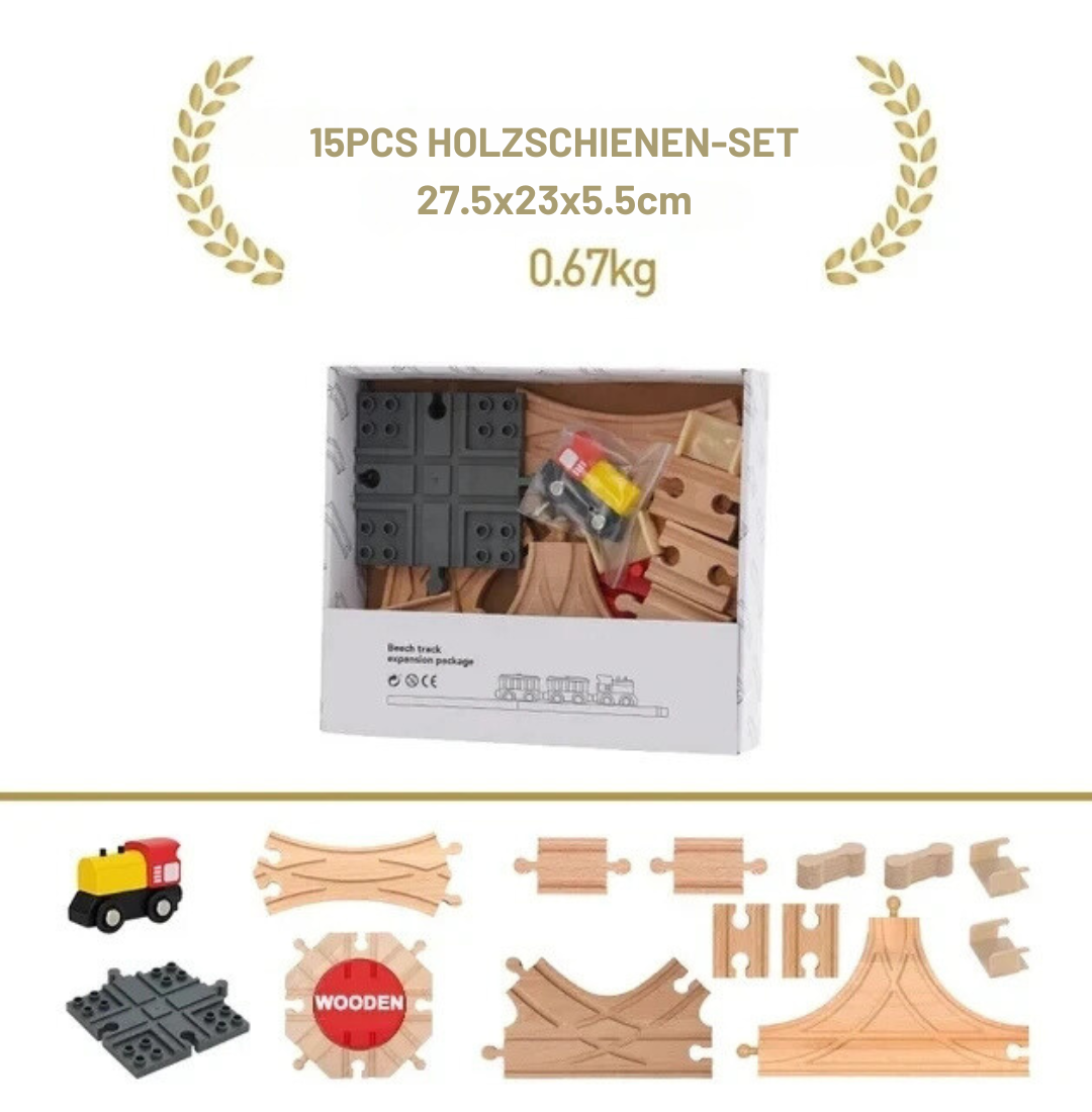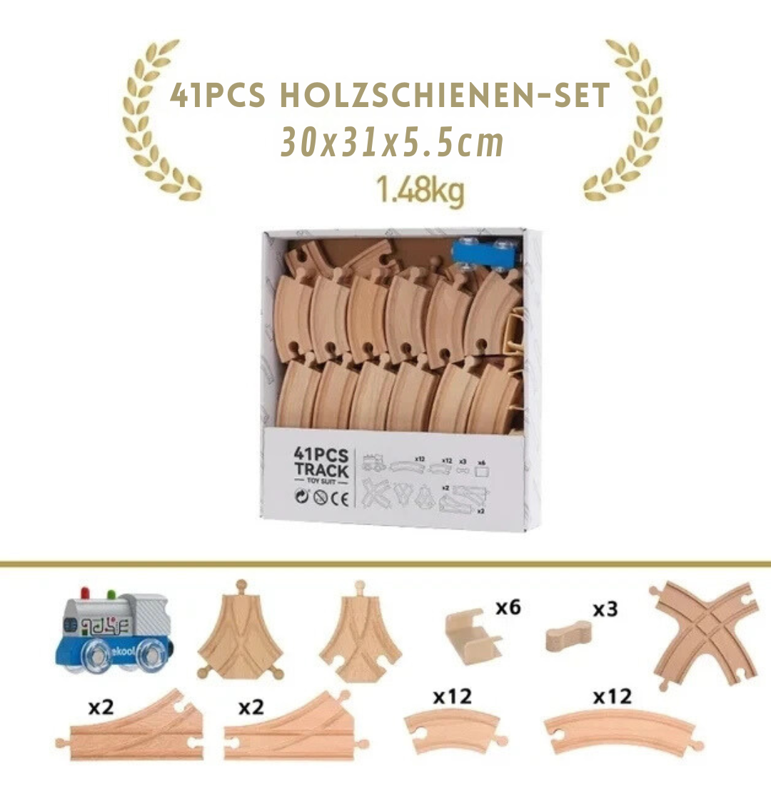 Das Holz-Eisenbahn-Set aus hochwertigem Buchenholz bietet endlosen Spielspass für Kinder. Es ist kompatibel mit allen gängigen Holzschienensystemen und ermöglicht es, Strecken individuell zu gestalten und immer wieder neu aufzubauen. Die robusten, glatt geschliffenen Schienen sind sicher für kleine Kinderhände und fördern Kreativität sowie Feinmotorik.