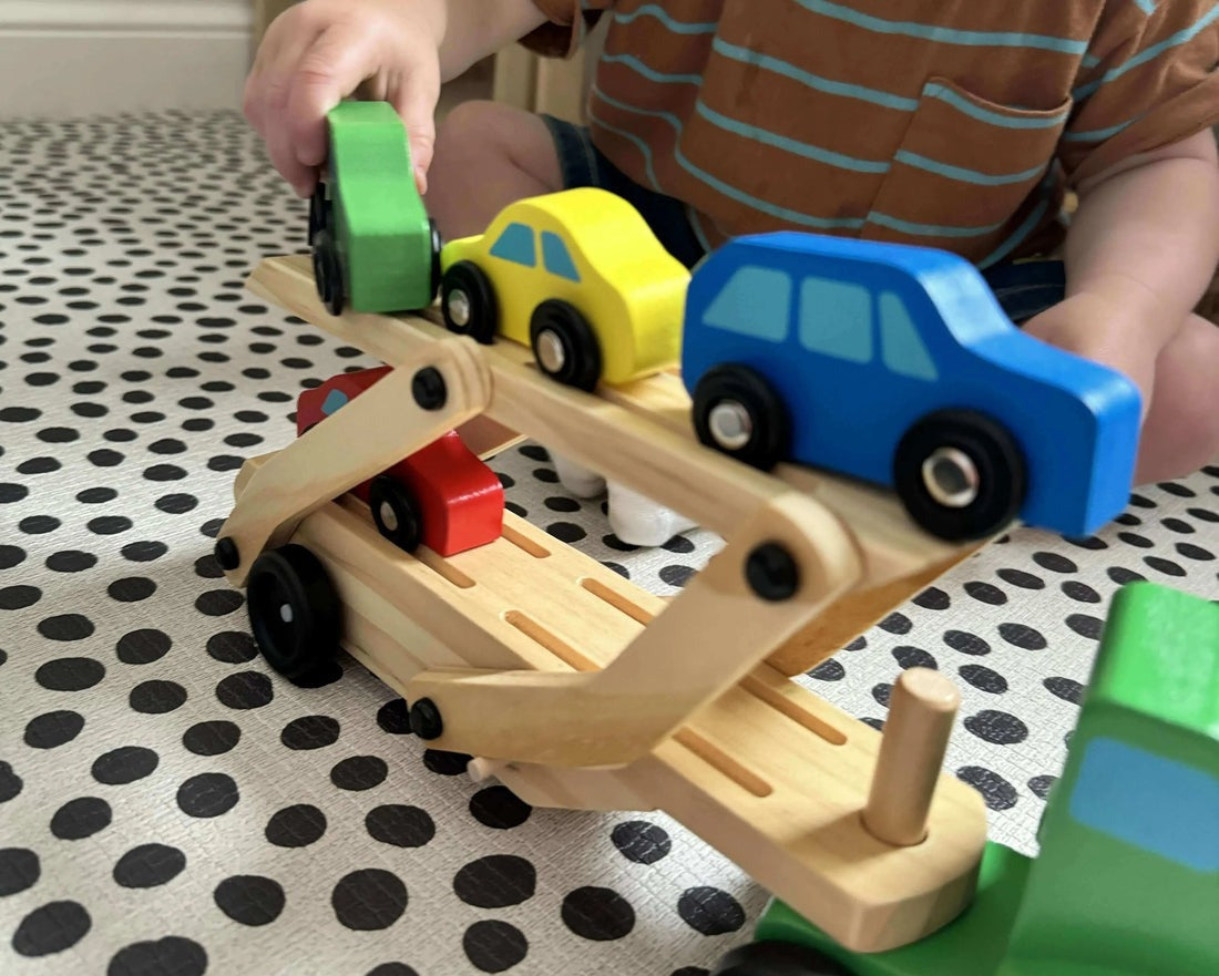 Das Transporter-Automodell aus Holzbauklötzen ist das perfekte Spielzeug für junge Baumeister und Autofans. Dieses doppellagige, sturzsichere Spielzeugset hilft Kindern, ihre Feinmotorik und ihr räumliches Vorstellungsvermögen zu entwickeln, während sie Spaß daran haben, ihre eigenen Fahrzeuge zu bauen. Die Bausteine aus haltbarem, ungiftigem Holz sind sicher für Kinder und halten auch rauem Spiel stand.