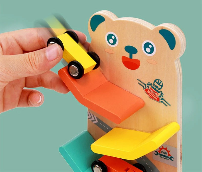 Die Holzrennbahn bietet mit ihrem lebhaften, farbenfrohen Design und den glatten Holzrampen endlosen Spass für Kleinkinder. Dieses Spielzeugset enthält 4 Mini-Autos, die die Rampen runterrasseln und so für stundenlange Unterhaltung sorgen und die motorischen Fähigkeiten und die Hand-Augen-Koordination fördern.